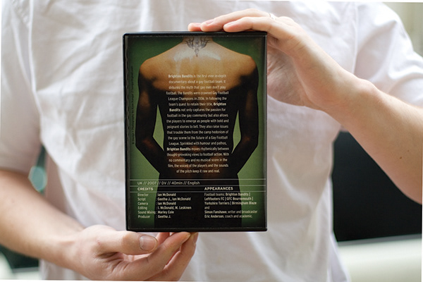 Poster and DVD cover design for Brighton Bandits, a documentary film about gay football, which premiered at the Cinecity Brighton Film Festival in December 2007. I photographed a member of the Bandits team from the front wearing his team strip, and naked from the back. I wanted to create an image with impact, but without drawing on stereotypes of gay life in Brighton, which the client was keen to avoid. The cropped head and the heavy shadows are appropriate for a film which deals with serious questions of identity and examines the interior lives of the players.