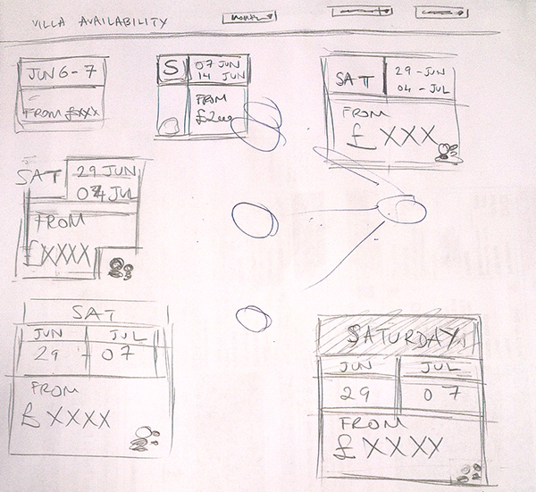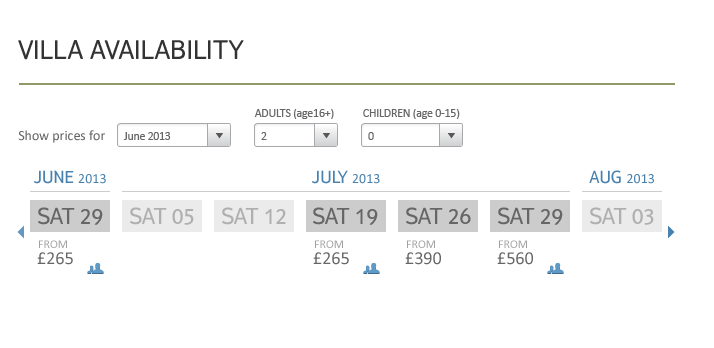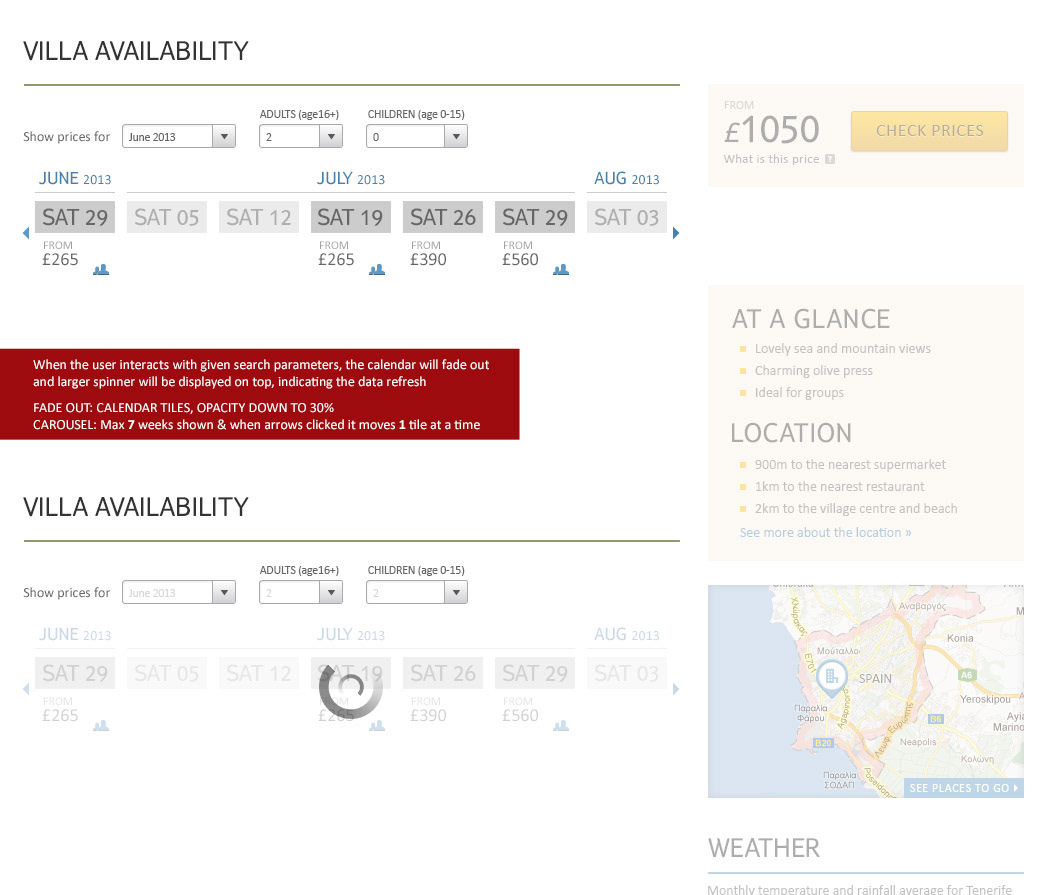 High-fidelity Ui design of a custom component; Villa Availability for Thomson Holiday's niche Villas product.